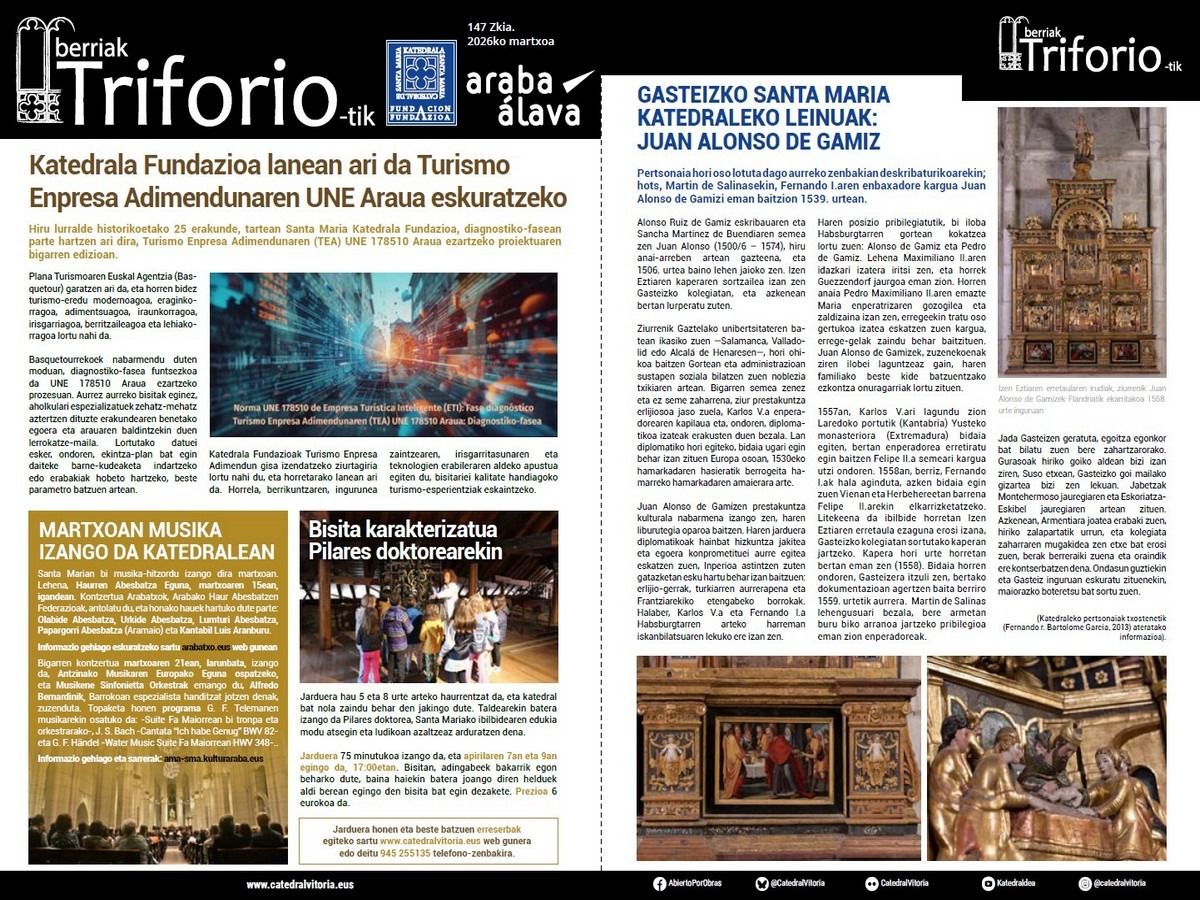 Estos meses están siendo muy especiales para nosotros. 25 años de vida de la Fundación en los que hemos trabajado junto a un gran equipo para que Santa María sea un gran referente patrimonial, cultural y turístico de Vitoria-Gasteiz -sin merma de su carácter religioso-, gracias a un proceso de restauración que se ha convertido en modelo a seguir.